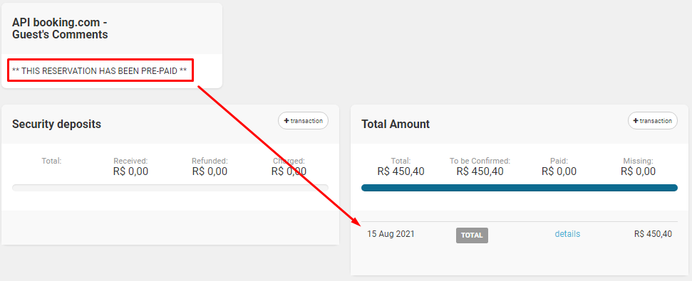 Reservations made with Booking prepayment after connecting to Stays, will get with the amounts already posted, just lacking the finance validation by the administrator. See the example below: