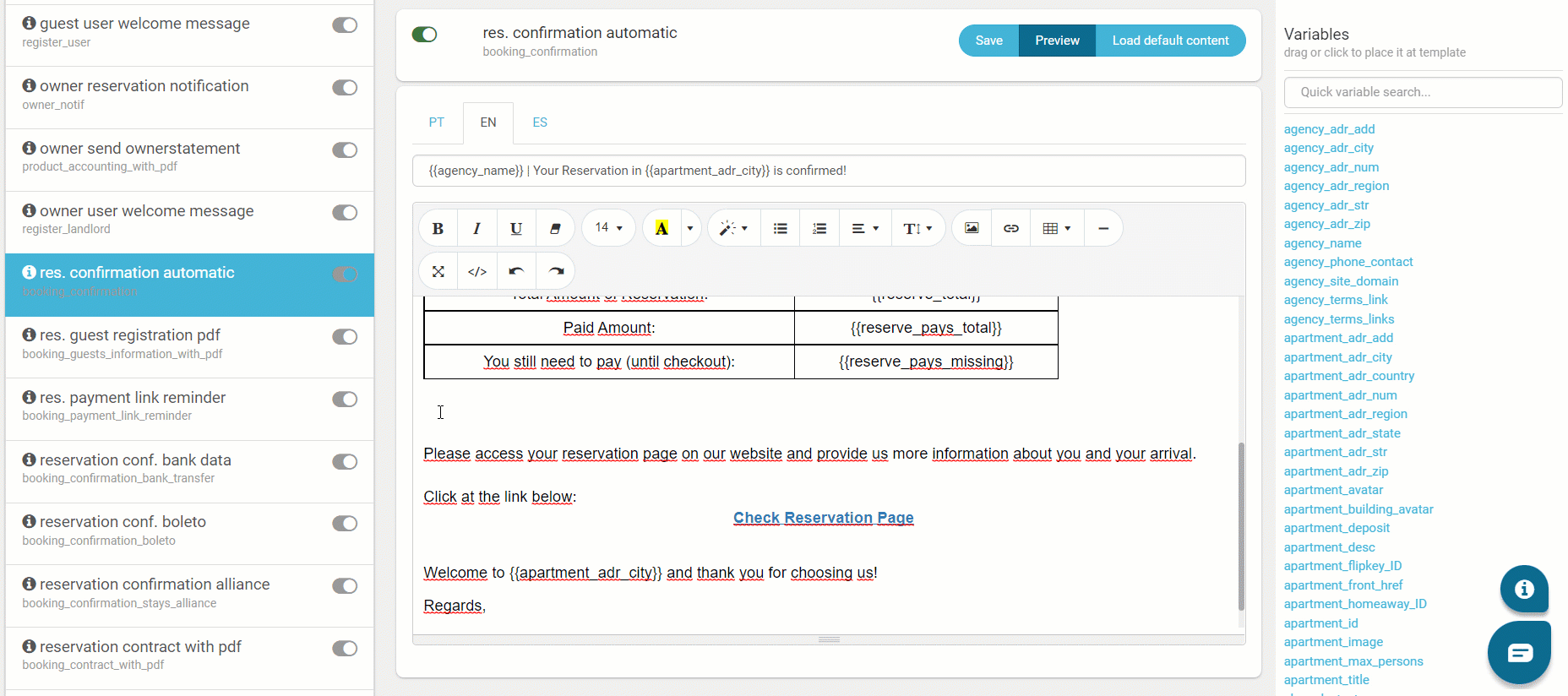 To apply this variable in your email templates, you will have to open the desired email and find the following variable on the right side of the screen: