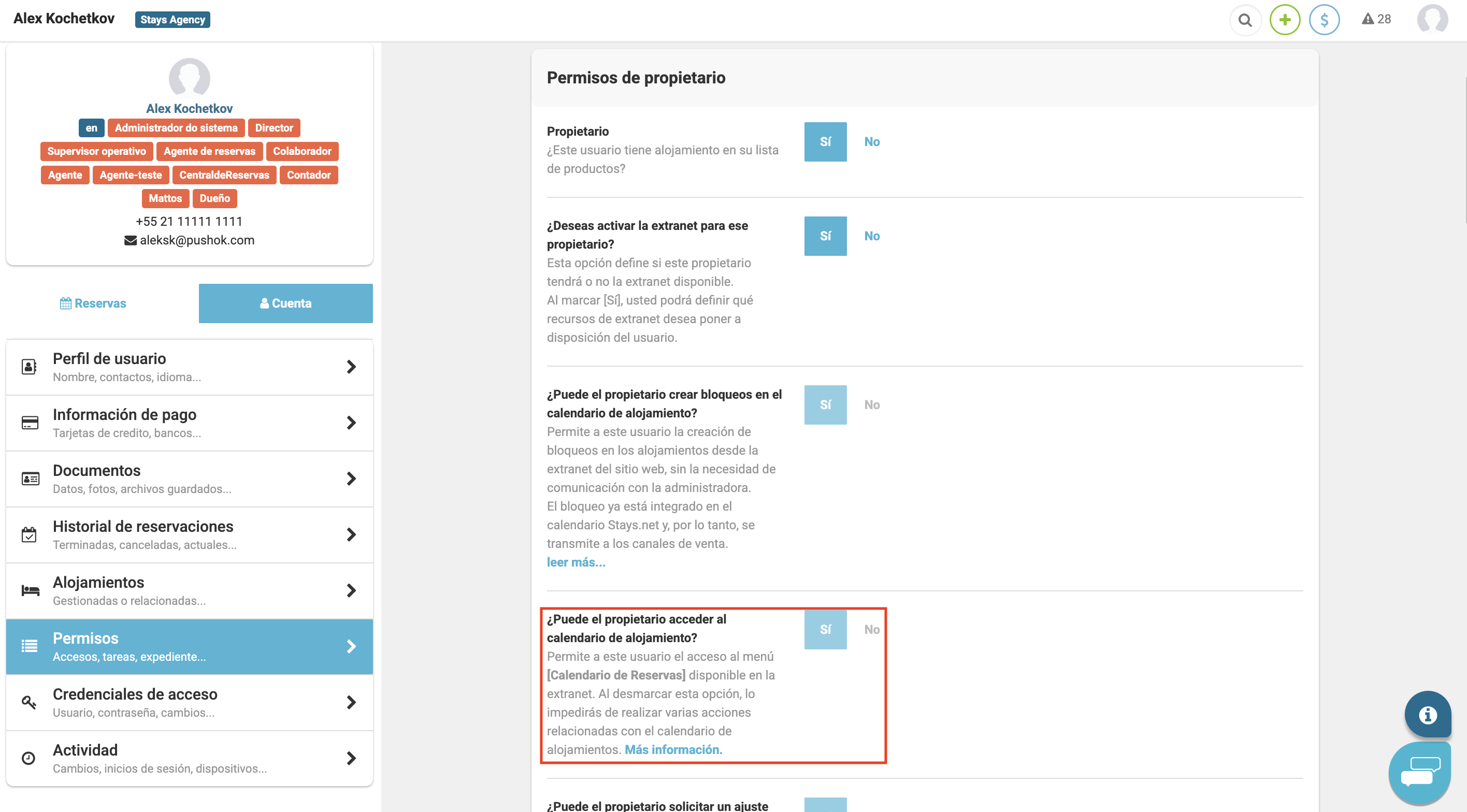 - Habilita el permiso [¿Puede el propietario acceder al calendario de alojamiento?] para visualizar el calendario;