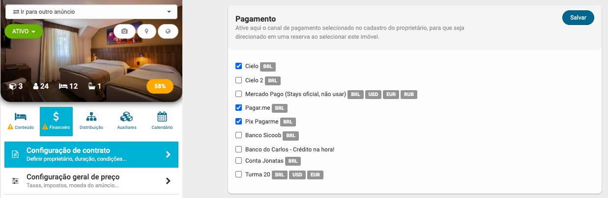 - Selecione os canais de pagamento a serem disponibilizados ao hóspede;